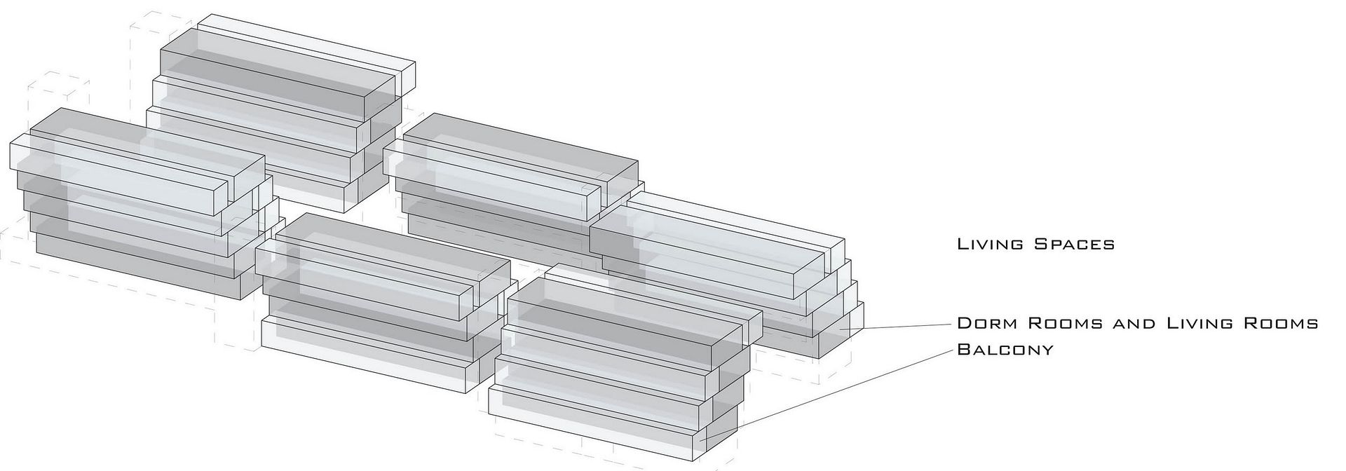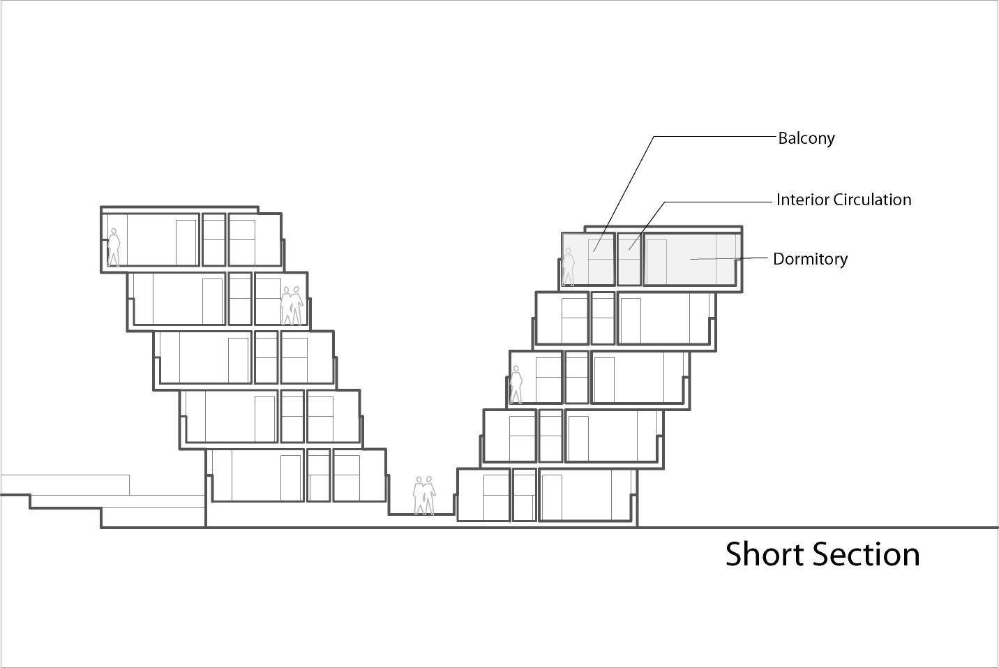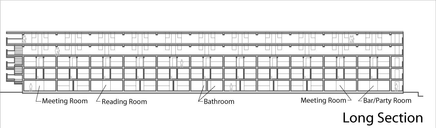The north-facing object is simply a bed supported by bookselves on both ends made simply of 3 vertical elements and several horizontal slabs in which books are to be placed. At the bottom of the bookshelves, is an easily accesible storage space. The bed and bookshelves are oriented so as to prevent light from the north from being obstructed.